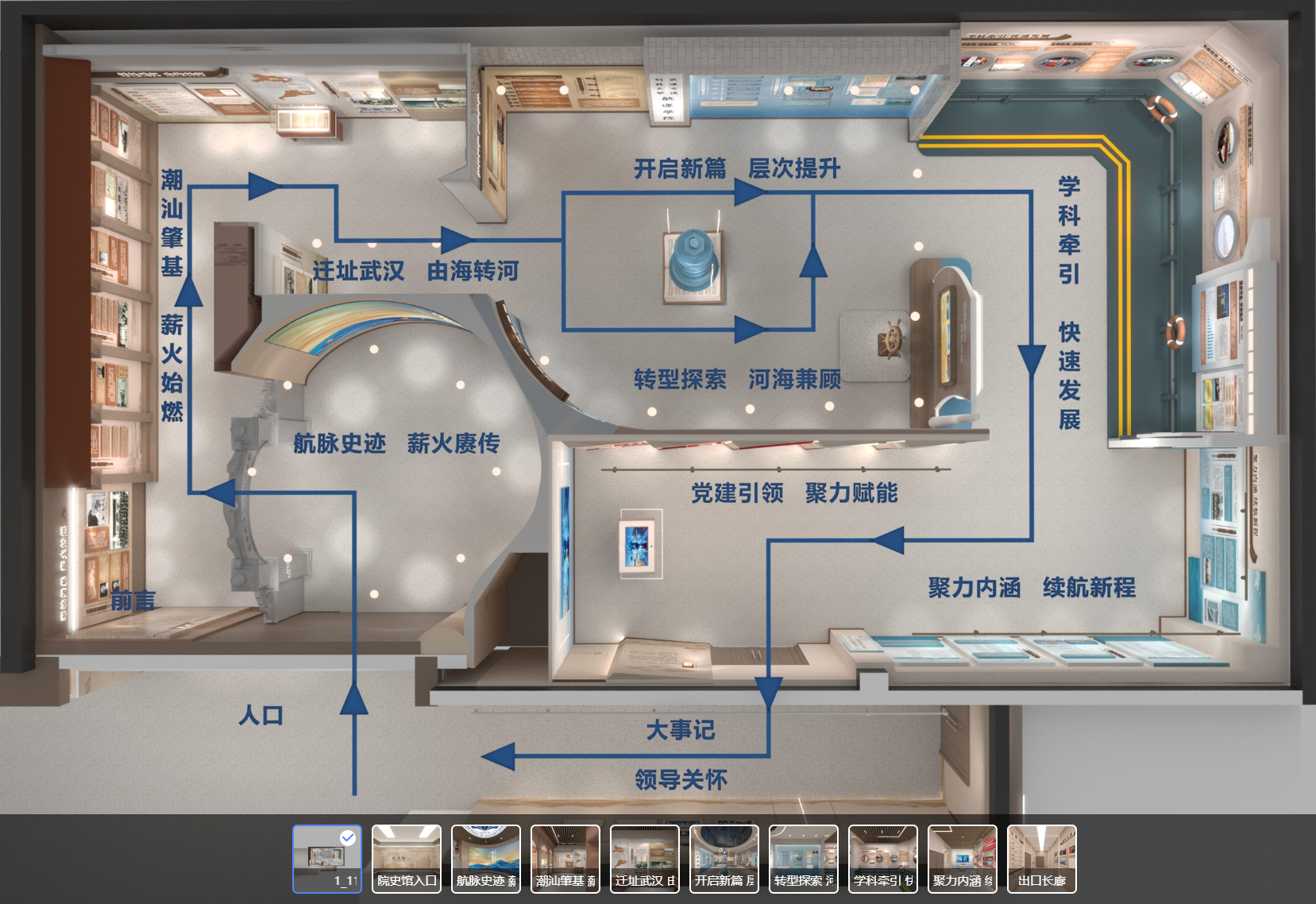 据了解,“云上”院史馆采用3D建模、VR全景、实景图片、视频展播、语音讲解等多元数字化手段,精准复刻了实体院史馆“航脉史迹ﻪ薪火赓传”“潮汕肇基 薪火始燃”“迁址武汉ﻪ由海转河”“转型探索 河海兼顾”“开启新篇ﻪ层次提升”“学科牵引 快速发展”“聚力内涵ﻪ续航新程”等全部展区。观众无需抵达现场,只需滑动屏幕,便可身临其境般在馆内自由“漫步”,借助放大细览、语音导览、视频点播等便捷功能,零距离、全方位了解环亚体育 八十年的办学历程、精神内涵与未来发展愿景。